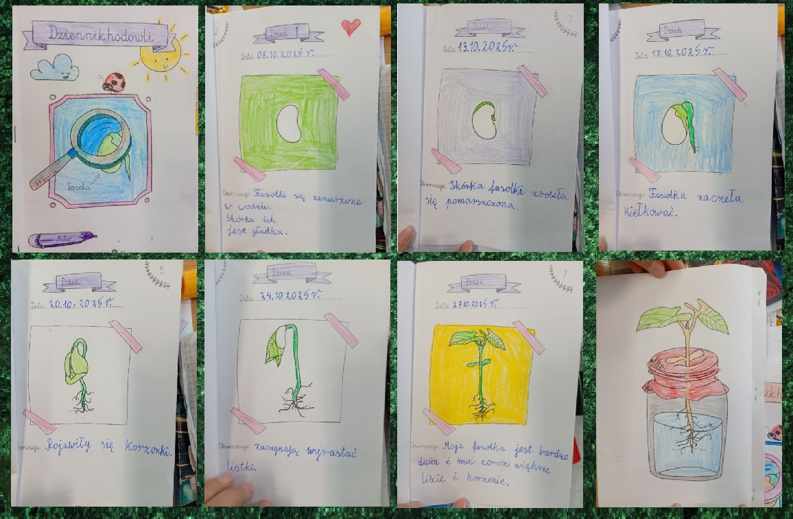 Efektem naszej pracy są pięknie wyrośnięte rośliny fasoli, które ozdabiają klasę, oraz dzienniczki obserwacji przedstawiające kolejne etapy ich rozwoju.