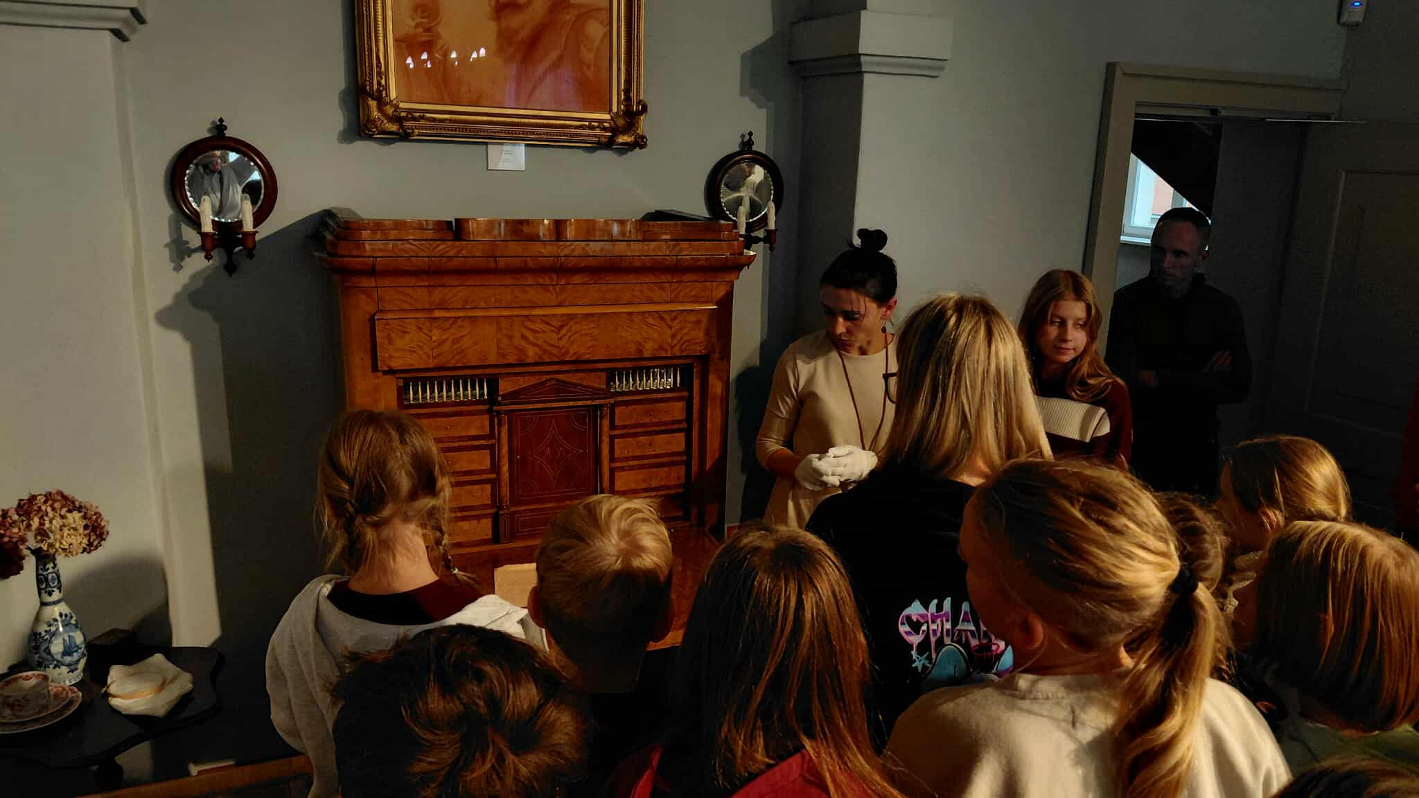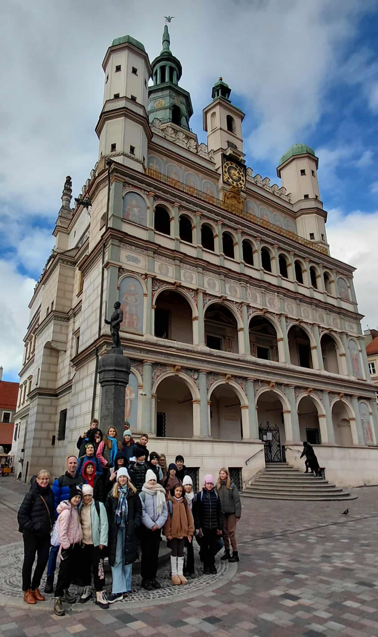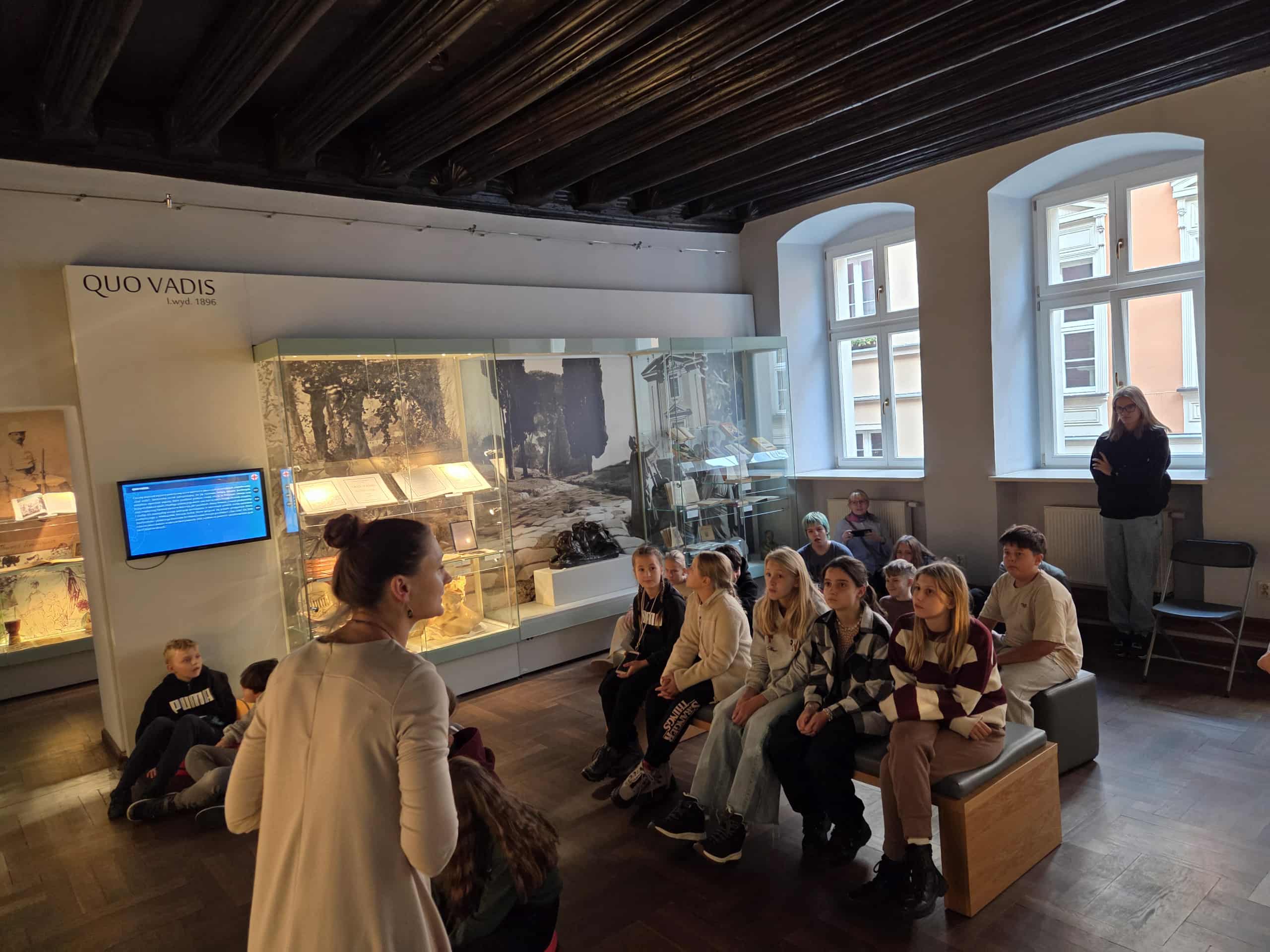 Pierwszym punktem jesiennej wycieczki było Muzeum Literackie Henryka Sienkiewicza, które stanowi oddział Biblioteki Raczyńskich w Poznaniu. Właśnie tam, w przepięknej renesansowej kamienicy uczestnicy wyprawy mieli okazję usłyszeć wiele ciekawych historii o życiu i twórczości polskiego noblisty. W tę wyjątkową literacko-biograficzną podróż zabrała uczniów pani Elizy Hamrol-Grobelnej, której dar opowiadania sprawił, że nieznane dotąd fakty z życia pisarza na pewno na długo zostaną w pamięci uczestników zajęć.