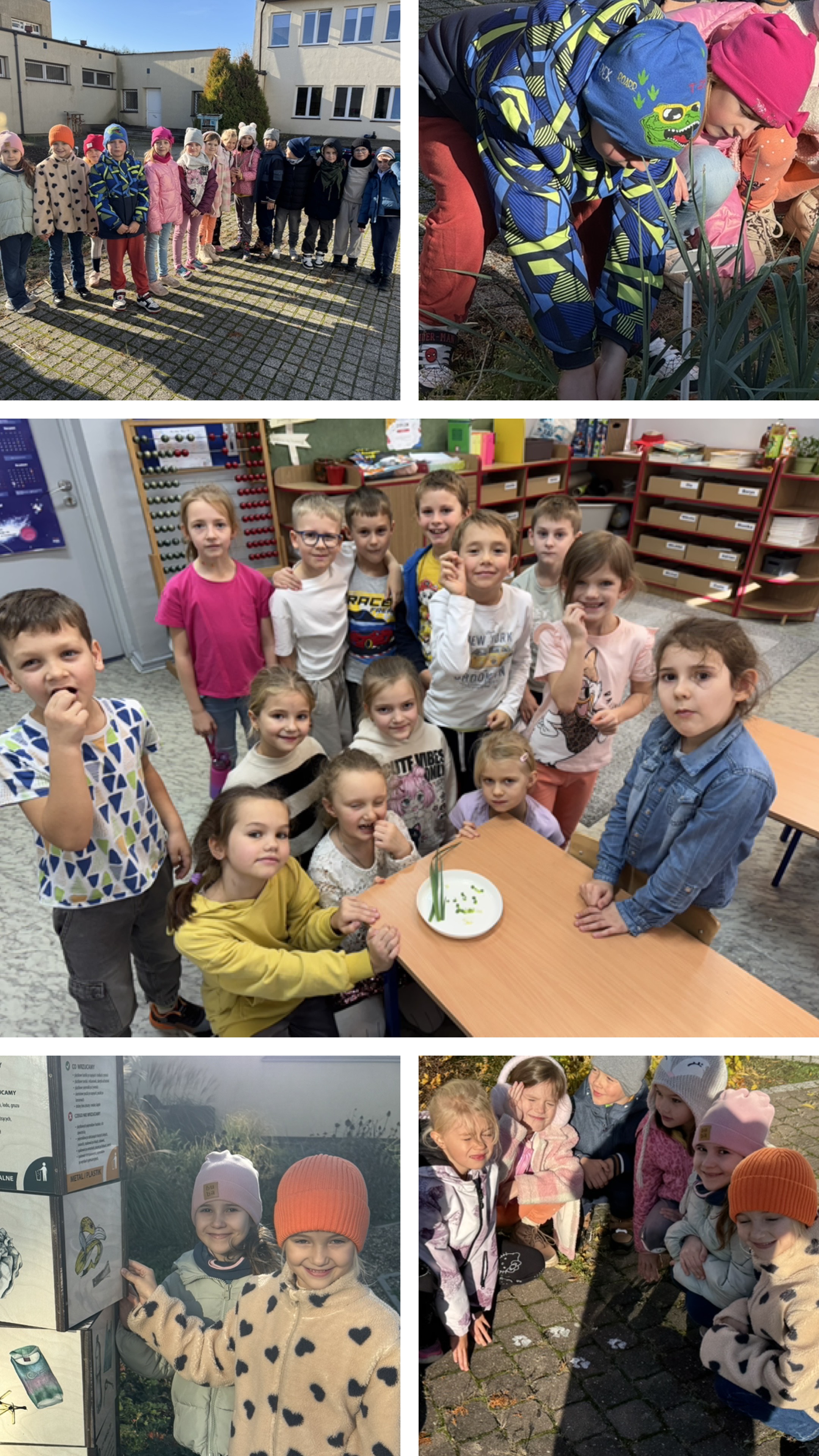 Najwięcej emocji wzbudziło jednak zbieranie plonów! Uczniowie z ogromnym entuzjazmem uczestniczyli w wyrwaniu pora, który rósł w szkolnych grządkach. Po powrocie do klasy dzieci dokładnie obejrzały to warzywo, poznały jego budowę – od białej łodygi aż po zielone liście – a także poczuły jego zapach, a chętni spróbowali, jak smakuje.