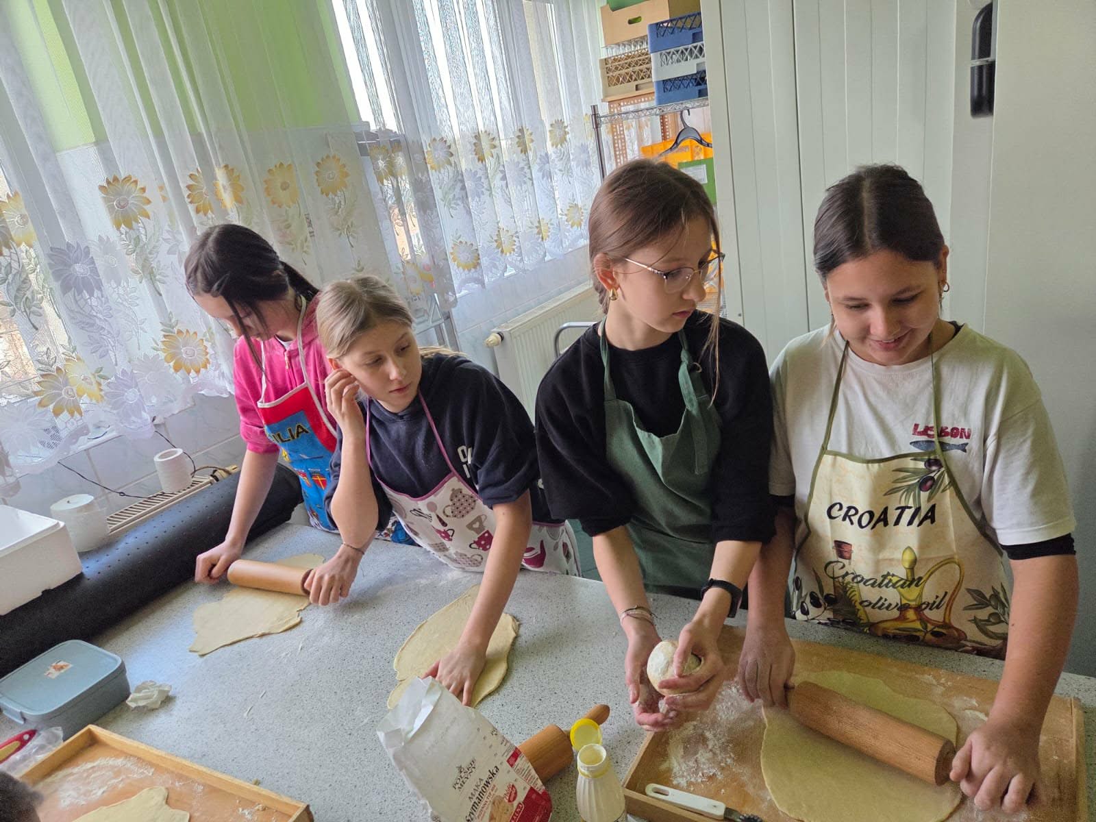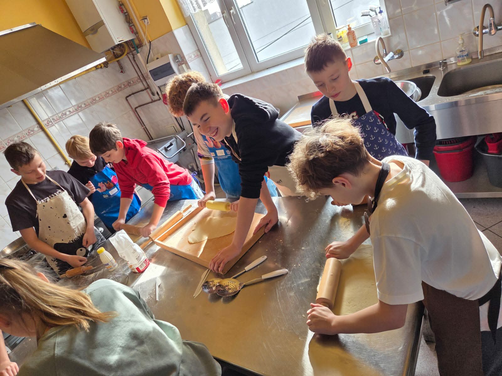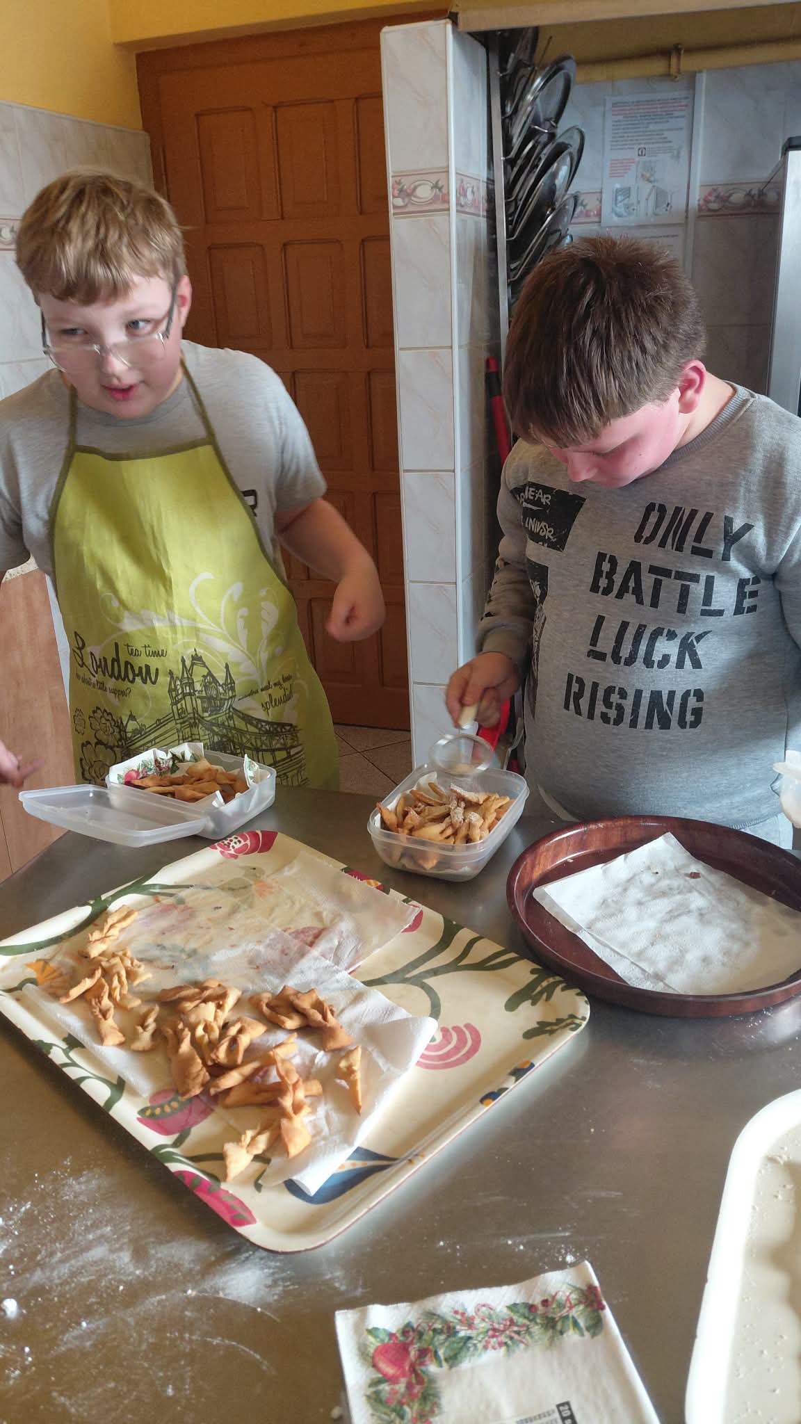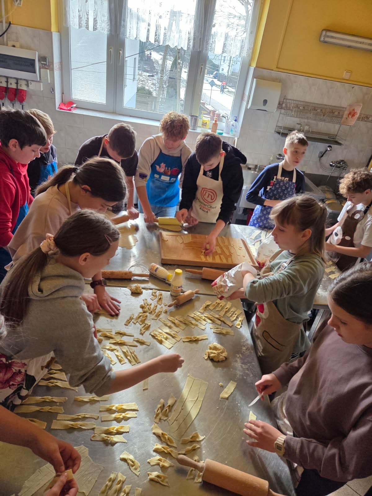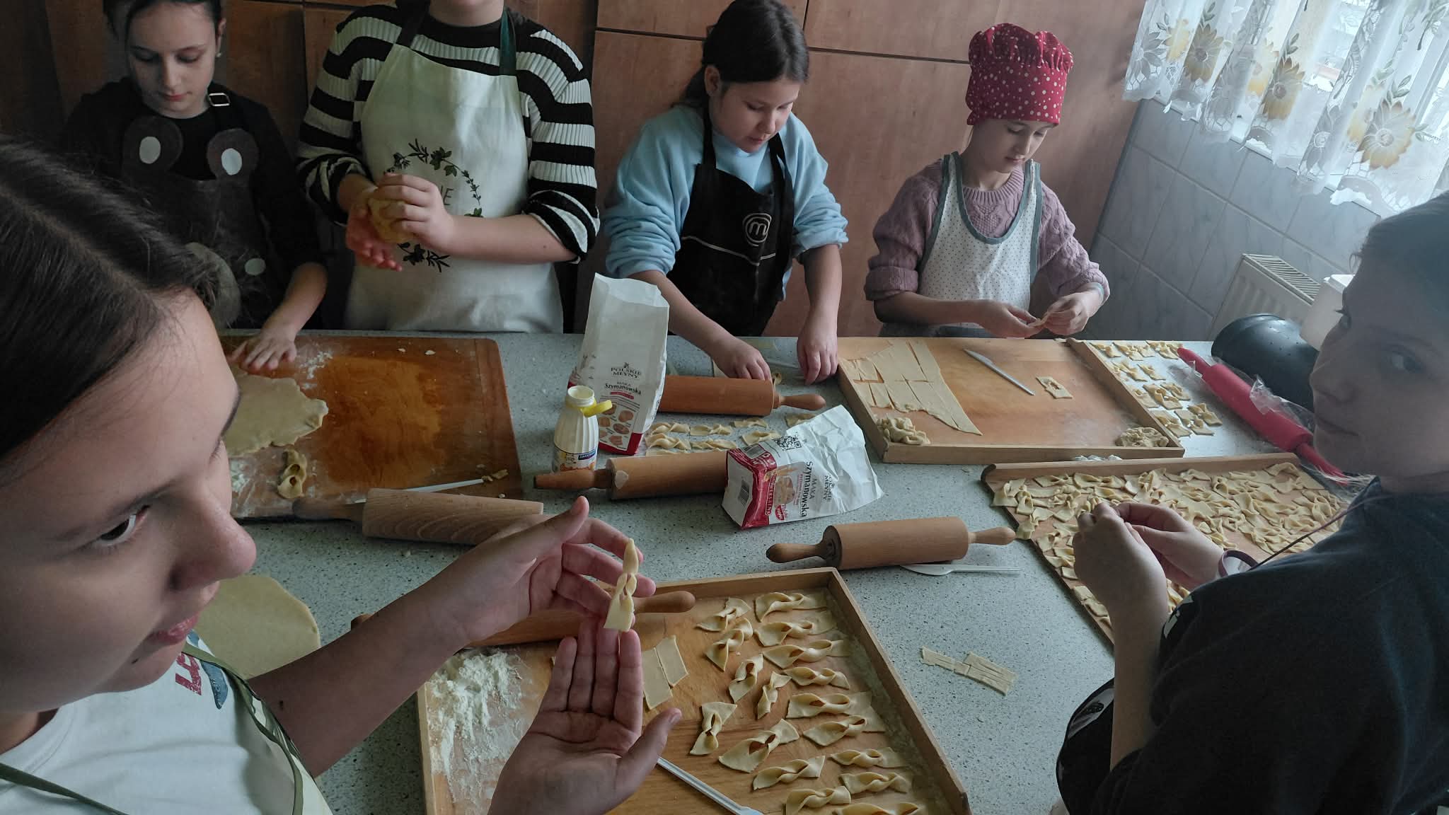 Uczestnicy zajęć byli doskonale przygotowani do pracy w kuchni, każdy ubrany był w fartuszek, wyposażony w wałek do ciasta i pełen zapału do ciężkiej pracy. A nie było łatwo, uczniowie: obmierzali mąkę, wbijali jajka, dolewali śmietanę, dokładali masło i w końcu je zagniatali. Potem przyszedł czas na wałkowanie, krojenie na paski i wywijanie ciasta, żeby powstały faworki. Tak przygotowany i wysuszony chrust trafił na patelnie. Smażeniem zajęli się oczywiście opiekunowie, po czym uczestnicy zajęć posypali karnawałowe wypieki cukrem pudrem i zjadali je ze smakiem, a resztę zabrali do domu.