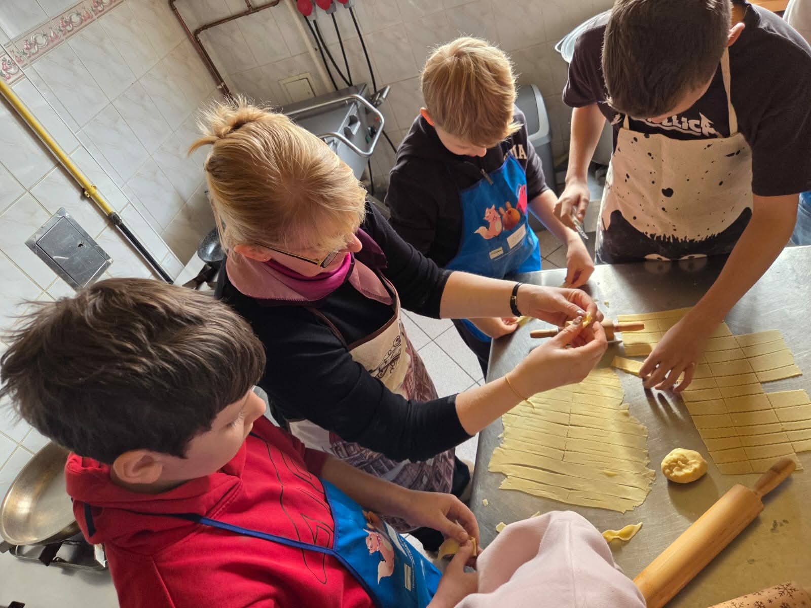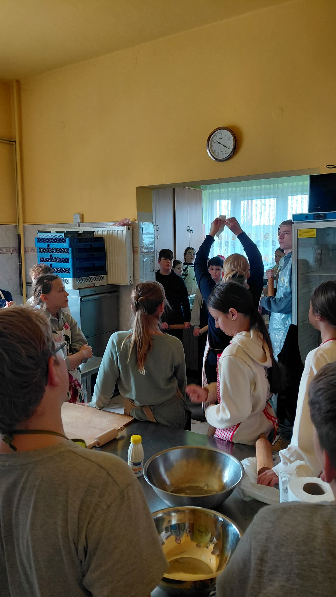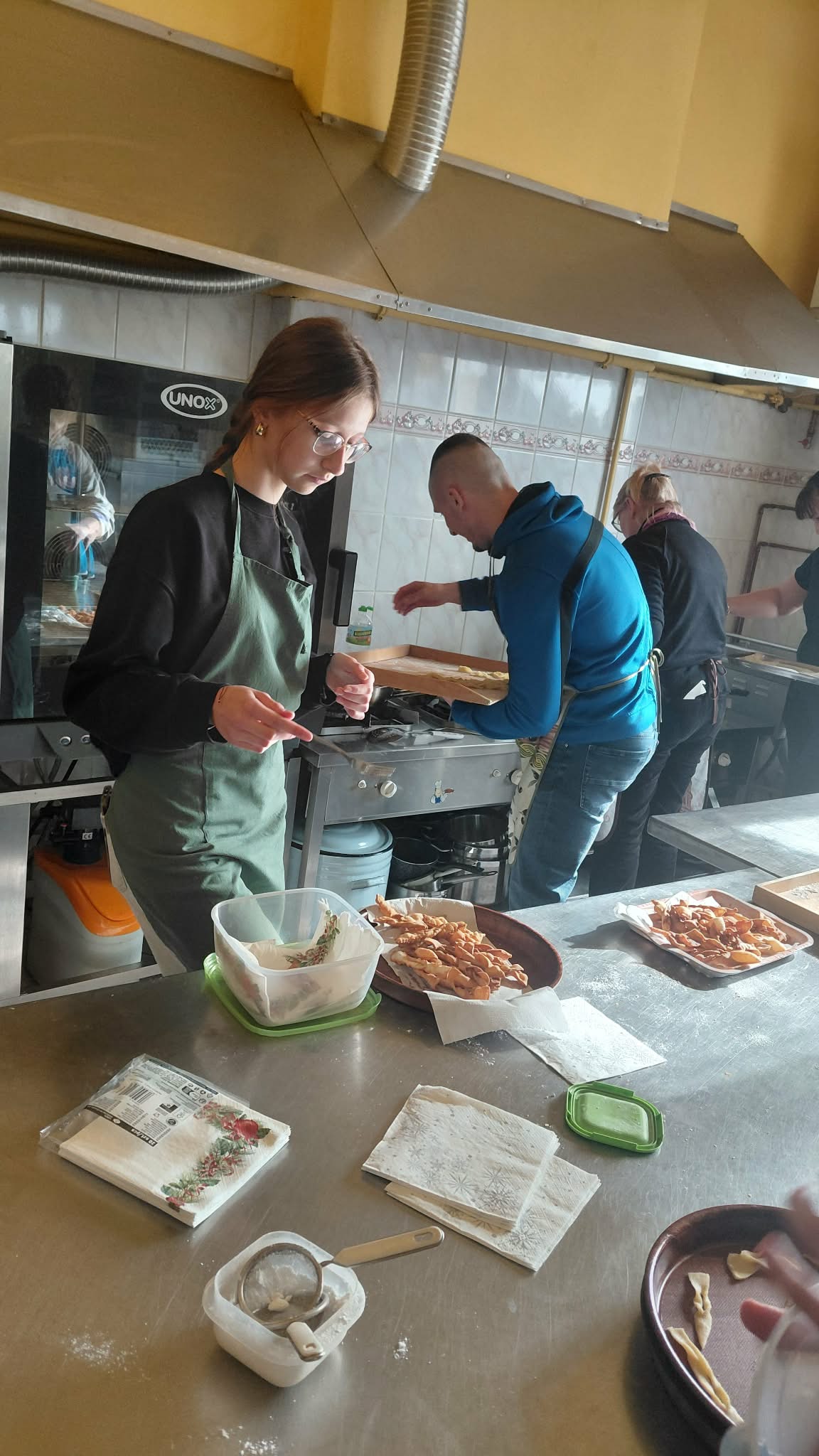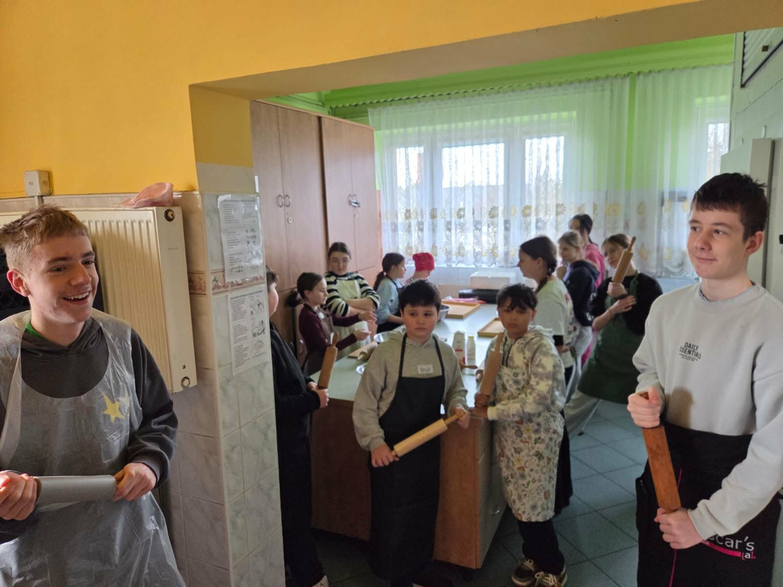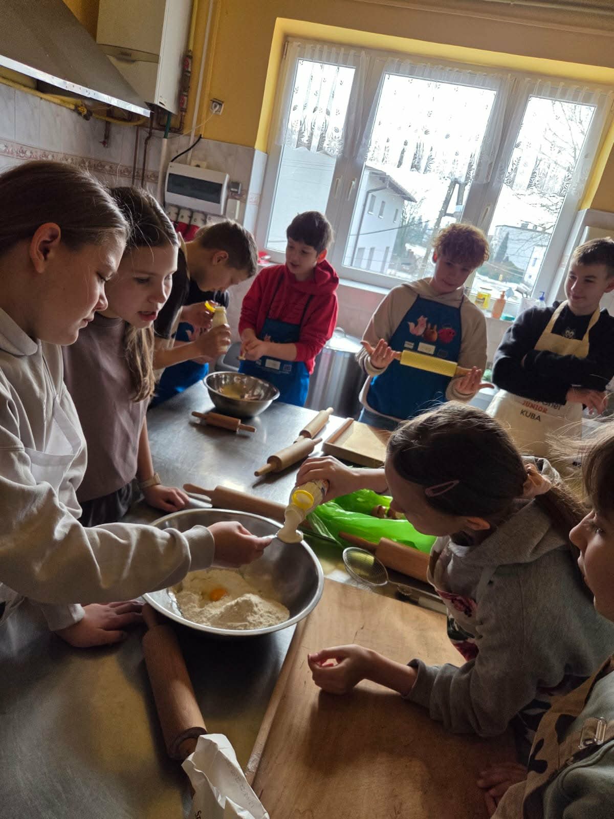 Uczestnicy zajęć byli doskonale przygotowani do pracy w kuchni, każdy ubrany był w fartuszek, wyposażony w wałek do ciasta i pełen zapału do ciężkiej pracy. A nie było łatwo, uczniowie: obmierzali mąkę, wbijali jajka, dolewali śmietanę, dokładali masło i w końcu je zagniatali. Potem przyszedł czas na wałkowanie, krojenie na paski i wywijanie ciasta, żeby powstały faworki. Tak przygotowany i wysuszony chrust trafił na patelnie. Smażeniem zajęli się oczywiście opiekunowie, po czym uczestnicy zajęć posypali karnawałowe wypieki cukrem pudrem i zjadali je ze smakiem, a resztę zabrali do domu.