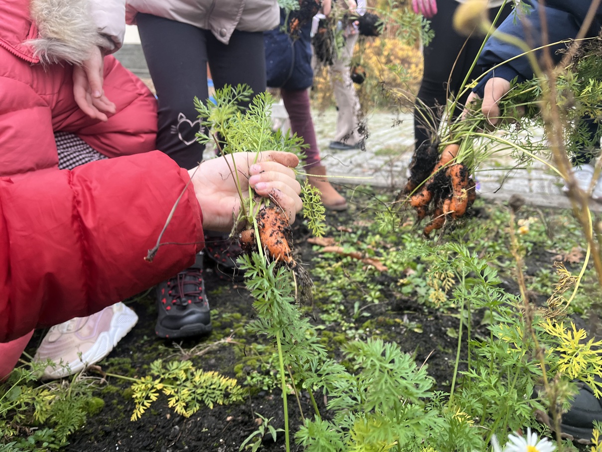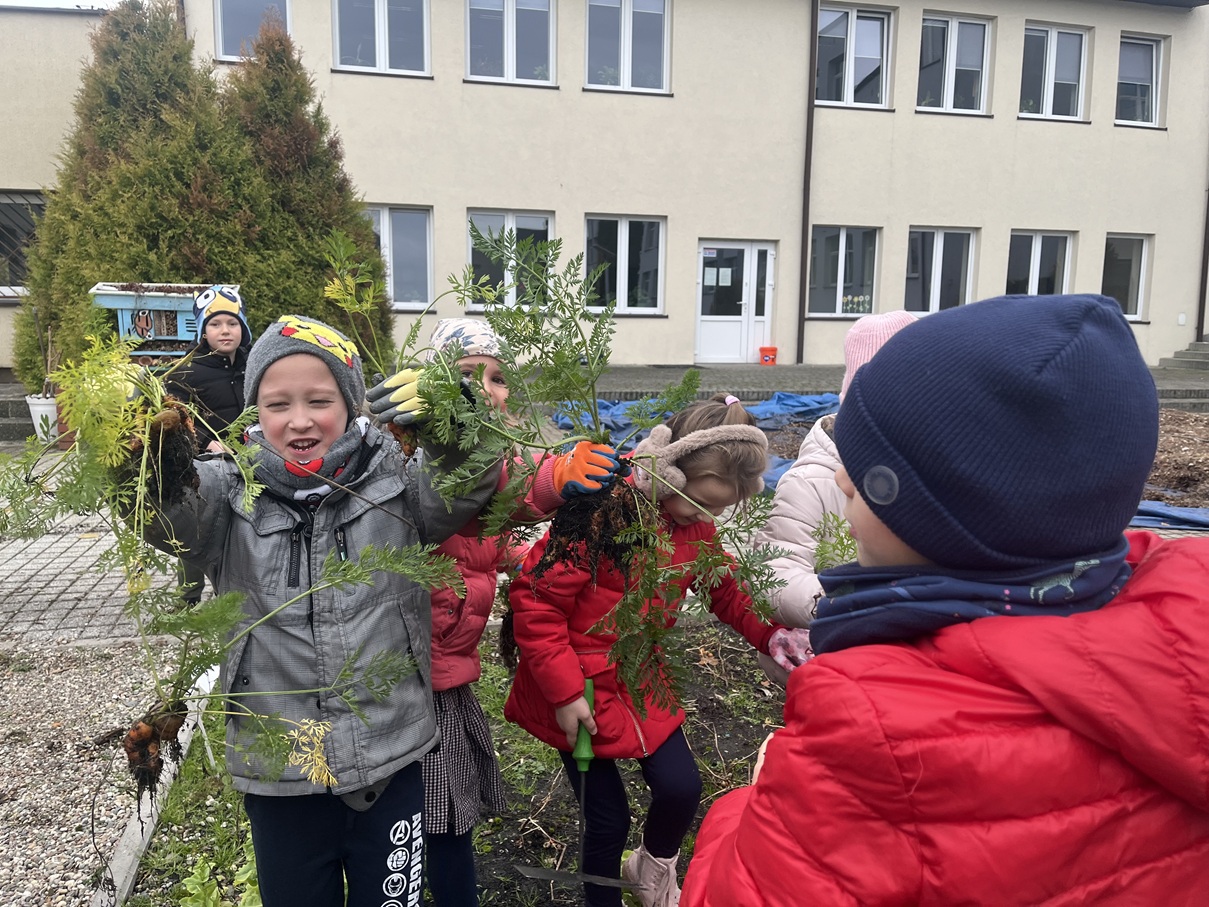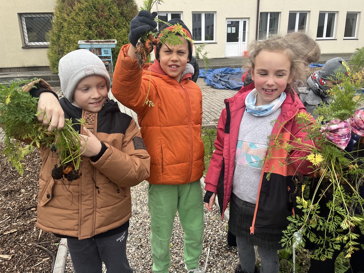 Marchewkowe zbiory w szkolnym ogródku – wspólna praca klas: 1a i 4d