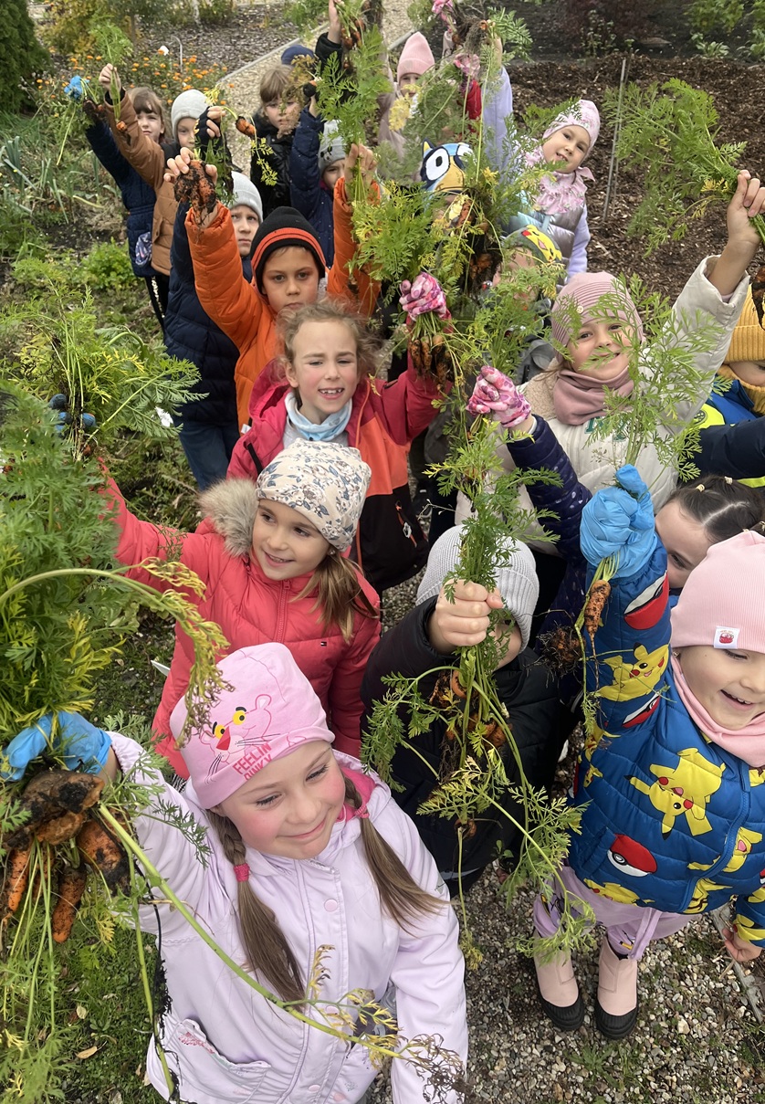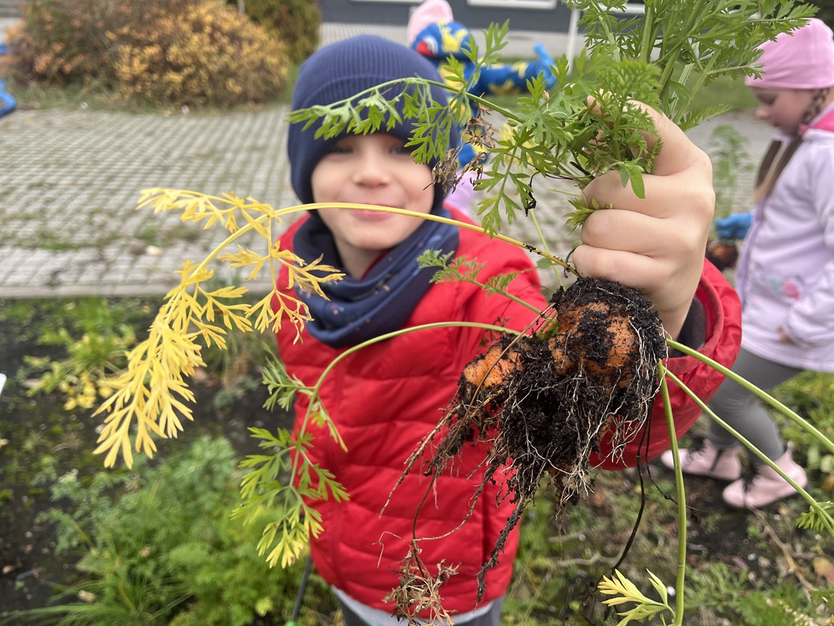 W ciepły, jesienny dzień szkolny ogródek znów tętnił życiem! Tym razem jego gospodarzami zostali najmłodsi uczniowie naszej szkoły – klasa 1a, która z ogromnym zapałem przystąpiła do zbioru marchewek. Nie były to jednak zwykłe marchewki – zasiali je jeszcze wiosną ich starsi koledzy i koleżanki z klasy 4d. Podczas zbiorów w ogródku panowała radosna atmosfera. Dzieci z klasy IA z zapałem ciągnęły za zielone natki, a z ziemi co chwilę wyłaniały się pomarańczowe niespodzianki – długie, krótkie, proste, a czasem zupełnie powyginane marchewki. Każde znalezisko wywoływało salwy śmiechu i zachwytu.