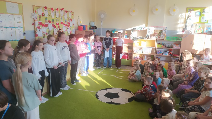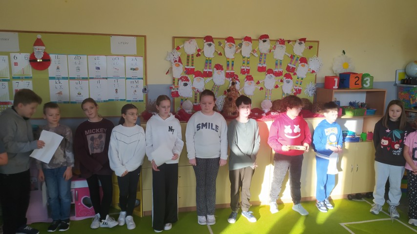 Uczniowie samodzielnie przygotowali scenariusz przedstawienia, wiersze oraz świąteczne życzenia. Ich kreatywne pomysły i ogromne zaangażowanie sprawiły, że przedstawiona opowieść poruszyła zarówno przedszkolną publiczność, jak i nauczycieli. Podczas spotkania wspólnie śpiewaliśmy i kolędowaliśmy, tworząc ciepłą, świąteczną atmosferę.