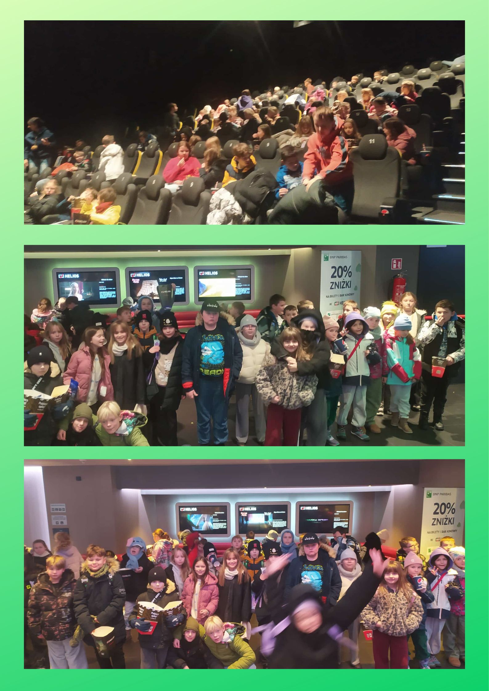 We wtorek 2 grudnia 2025 roku, uczniowie klas trzecich pojechali do kina Helios w Pabianicach, na film animowany pod tytułem ,,Zwierzogród 2”. Przed seansem większość uczniów zakupiła popcorn i zimne napoje. Następnie wszyscy udali się do sali kinowej. Uczniowie oglądali film z wielkim zainteresowaniem. Była to niezwykle zabawna i pełna zwrotów akcji opowieść o poczynaniach detektywów - Judy Hops i Nicka Bajera. W filmie pojawiała się również urokliwa muzyka, która zachęcała oglądających do tańca.