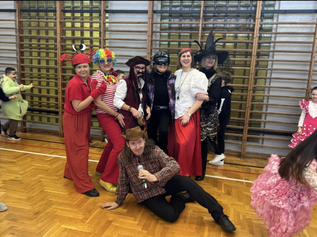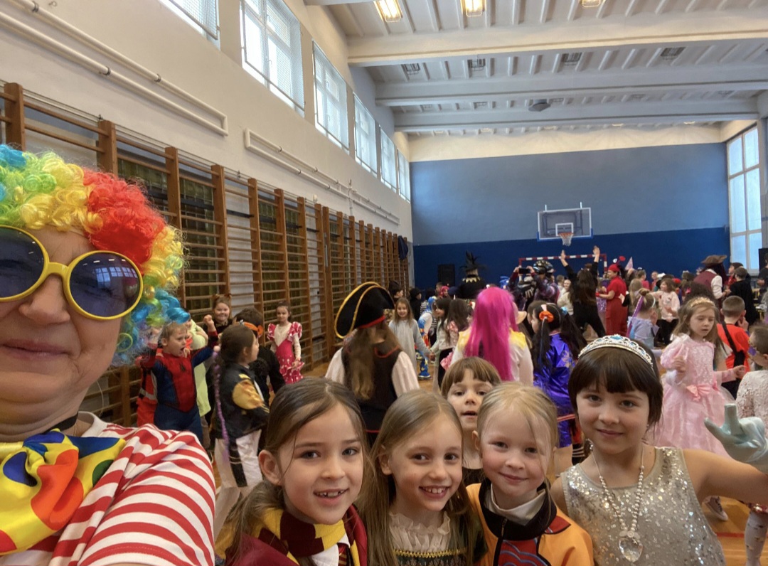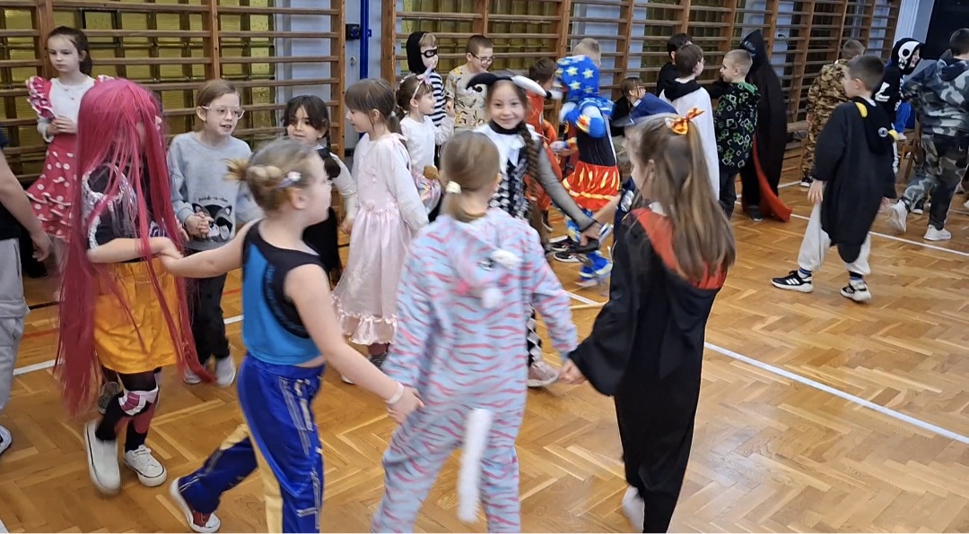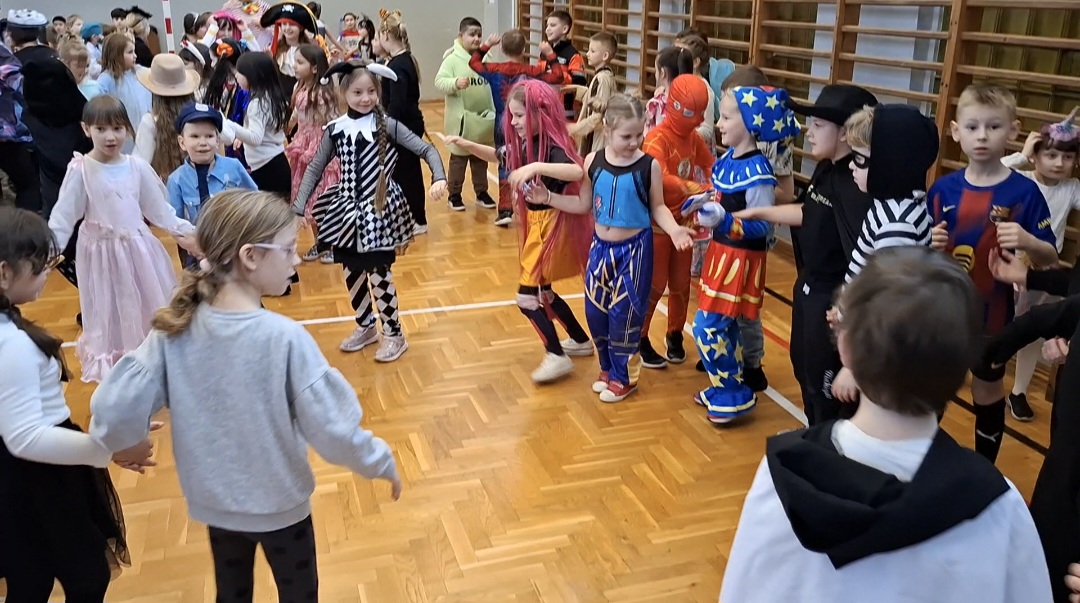 Dnia 17 lutego 2026 roku uczniowie klas 1–3 wzięli udział w długo wyczekiwanej zabawie karnawałowej. Tego dnia szkolne korytarze i sala gimnastyczna zamieniły się w barwną, pełną radości przestrzeń, w której królowały bajkowe postacie, superbohaterowie, księżniczki, zwierzątka oraz wiele innych kreatywnych przebrań.