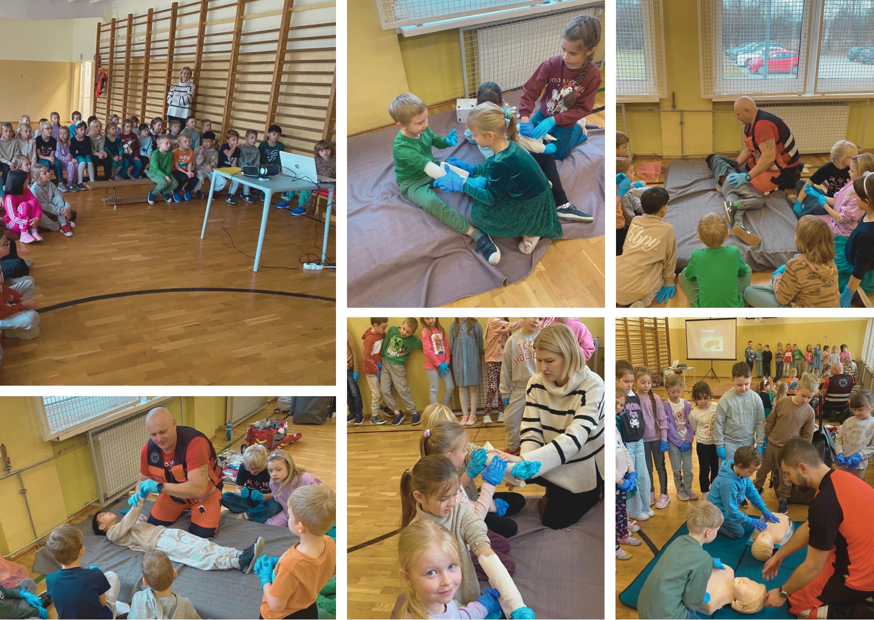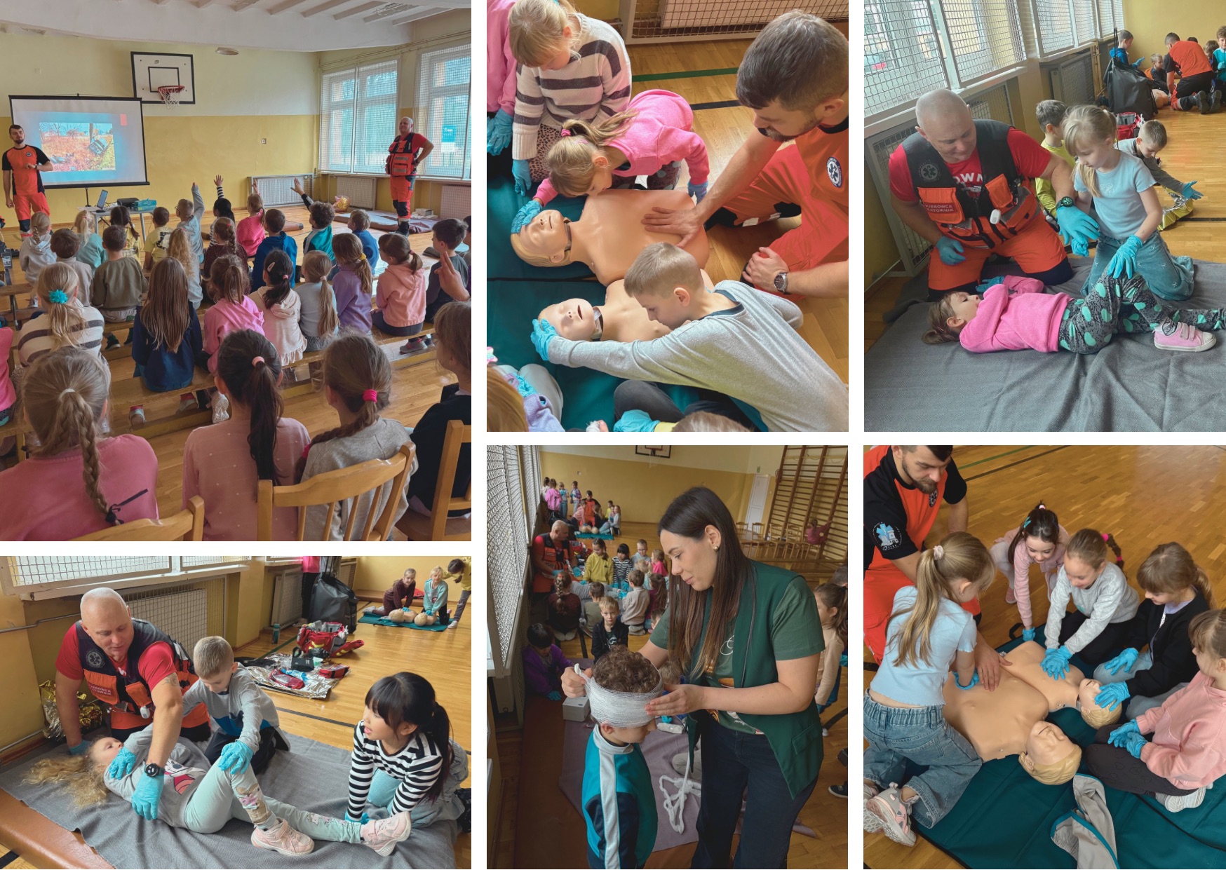 Po wprowadzeniu teoretycznym dzieci przystąpiły do ćwiczeń praktycznych. Pierwszoklasiści mogli przećwiczyć resuscytację krążeniowo-oddechową na fantomie, uczyli się, jak ułożyć poszkodowanego w pozycji bocznej ustalonej, oraz samodzielnie bandażowali „poszkodowanych”. Zajęcia dostarczyły im nie tylko wiedzy, ale także dużo radości i poczucia sprawczości.